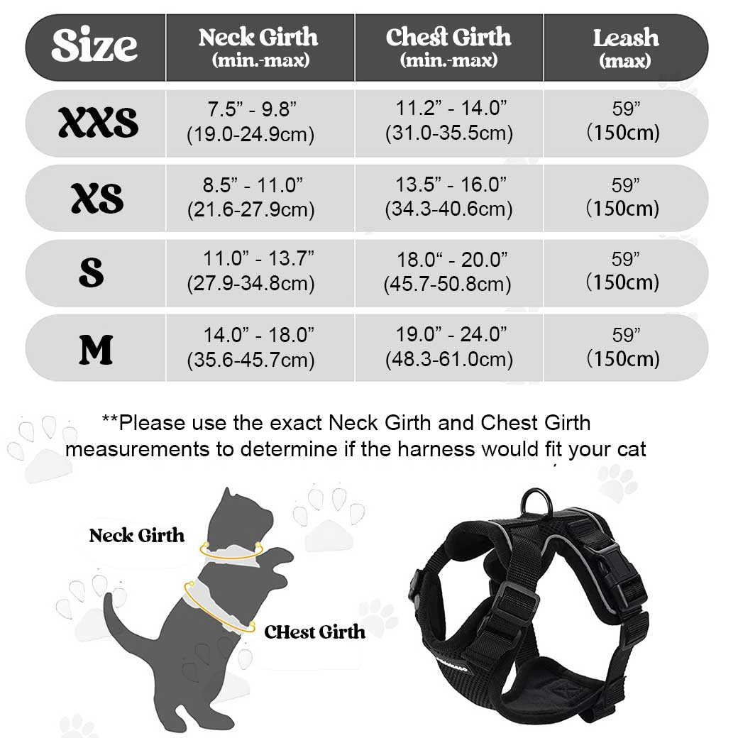 ►Note: Please measure your pet carefully and refer to the size chart before purchase! If your cat is between sizes, please choose the smaller size. This cat harness is not for newborn babies or extra small kittens. If you’re still not sure, please write back to us!